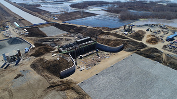2018年,形象進度為進出水渠、站身基坑開挖基本完成、進口護坦水撼砂全部完成、進口翼墻1#、2#、3#、4#全部完成、站身主體完成底板、進水流道層、水泵層及出水流道層底板(高程58.35)、站身及翼墻回填至高程52.3、灌注樁冠梁全部完成、出口兩側翼墻超流態(tài)樁全部完成。