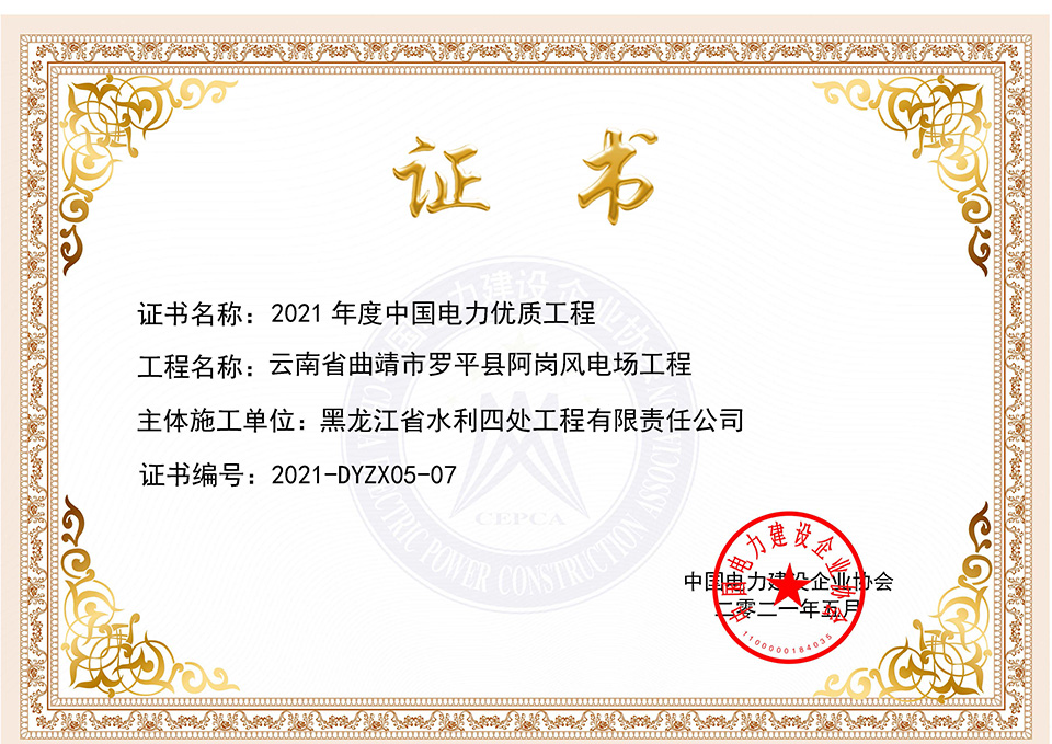 2021年5月13日,由我公司承建施工的云南省曲靖市羅平縣阿崗風(fēng)電場(chǎng)工程榮獲2021年度中國(guó)電力優(yōu)質(zhì)工程獎(jiǎng) ,標(biāo)志著我公司工程質(zhì)量管理和工程質(zhì)量創(chuàng)建水平提升到了一個(gè)新臺(tái)階。