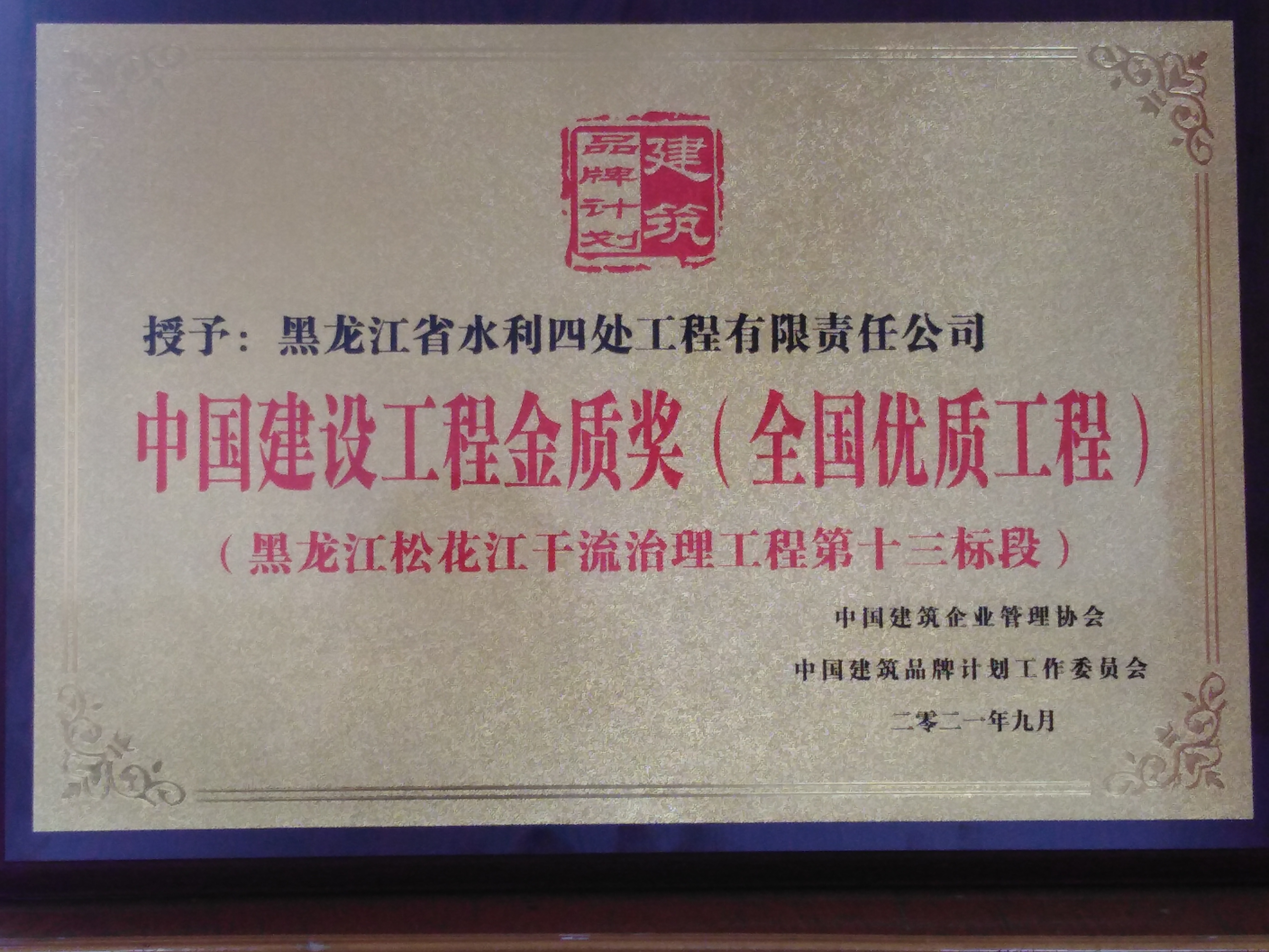 2021年9月,在2021年度中國建筑品牌計(jì)劃評選活動(dòng)中,經(jīng)評委會(huì)綜合評定,我公司被中國建筑企業(yè)管理協(xié)會(huì)、中國建筑品牌計(jì)劃工作委員會(huì)授予“中國建設(shè)工程金質(zhì)獎(jiǎng)(全國優(yōu)質(zhì)工程)”。