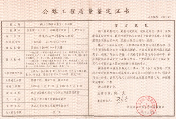 佳七十五標(biāo)質(zhì)量鑒定書(shū)